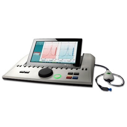 Imitanciômetro automático que realiza timpanometria, reflexos IPSI e contralaterais, tone decay, teste de função tubária e audiometria por via aérea.